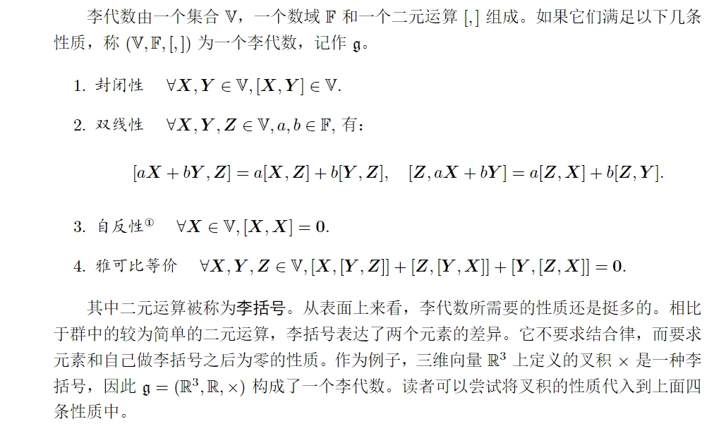 李群是指具有连续光滑性质的群。每个李群都有对应的李代数